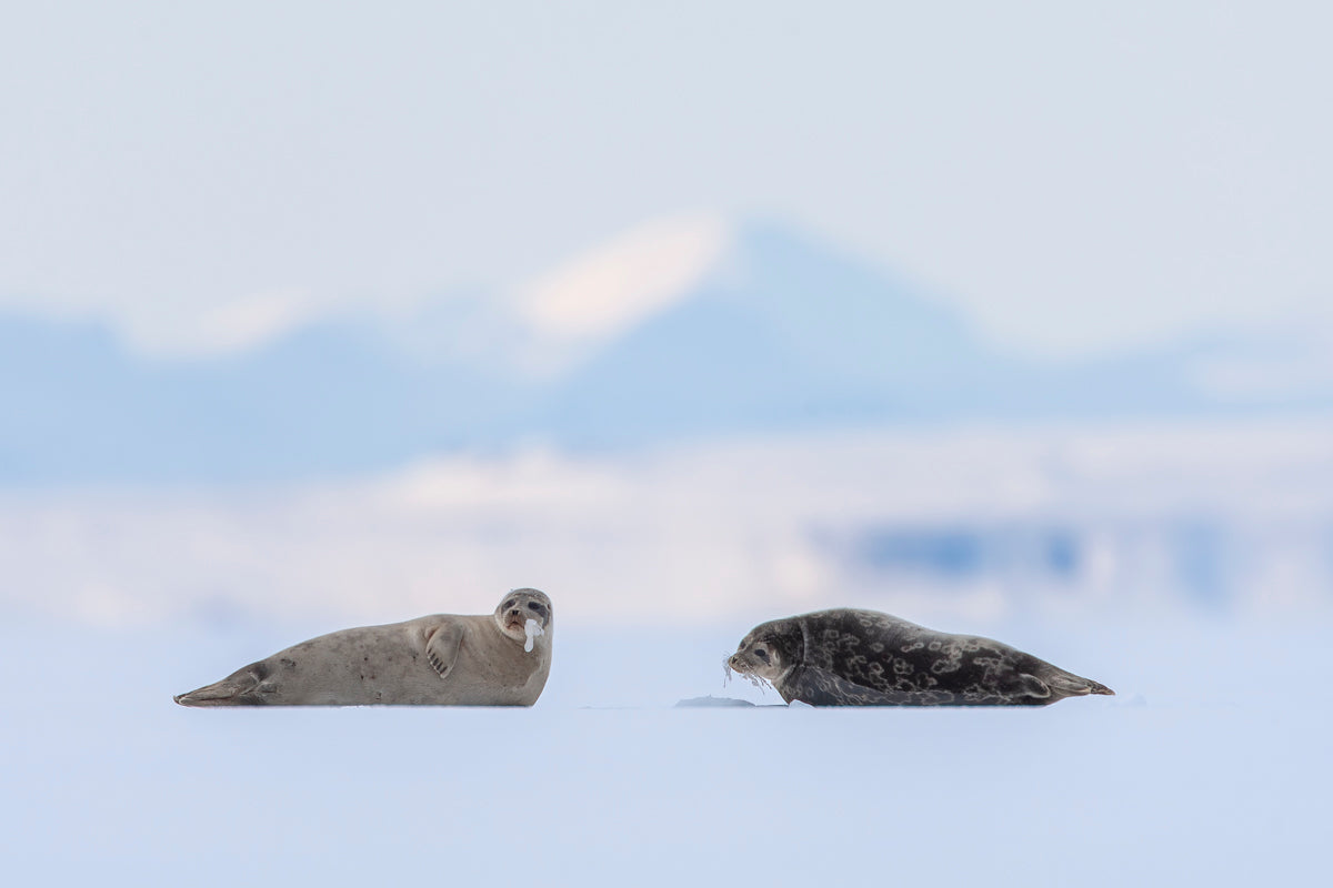 1・2月の作品は、マイナス30℃と凍てつく海に穴を開けて氷上で寝そべるワモンアザラシたちです。ノルウエー北極圏での撮影です。