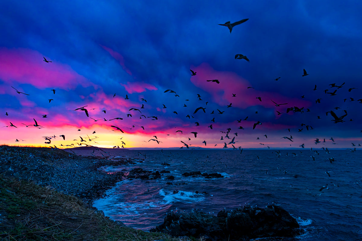 3・4月の作品は、異様に染まった朝焼けのなかを舞う繁殖のため海岸に集結したウミネコです。北海道天売島での撮影です。