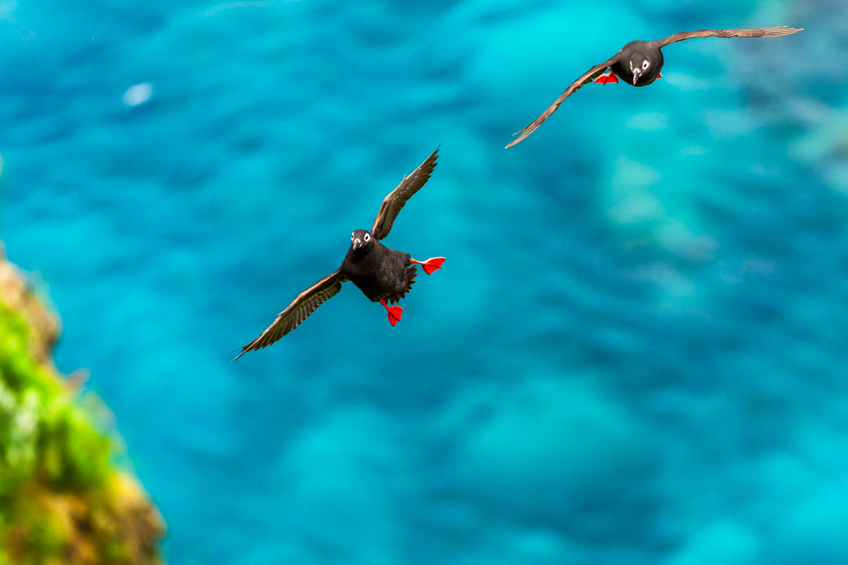 7・8月の作品は、巣がある断崖の目前に広がる海を大きく旋回して飛翔するケイマフリです。北海道天売島での撮影です。